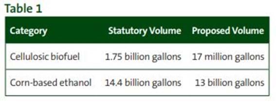 For 2014, EPA has proposed reducing the total renewable fuel mandate from 18.15 billion gallons to 15.21 billion gallons. It also wants to reduce the advanced biofuel mandate from 3.75 billion gallons to 2.20 billion and to reduce the cellulosic biofuel mandate from 1.75 billion gallons to 17 million gallons. Table 1 shows the proposed volume reductions for cellulosic ethanol and conventional corn-based ethanol.