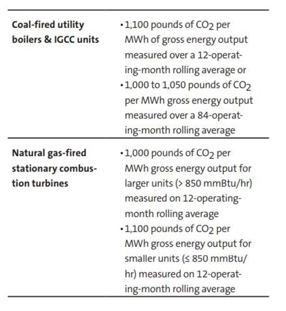 To help put these emissions rates into context, EPA cited government estimates that a new subcritical pulverized coal unit firing bituminous coal would emit CO2 at a rate of about 1,800 pounds per MWh and a new IGCC unit would emit at a rate of about 1,450 pounds of CO2 per MWh. A new natural gas-fired combined-cycle unit emits CO2 at a rate of about 800 pounds of CO2 per MWh.