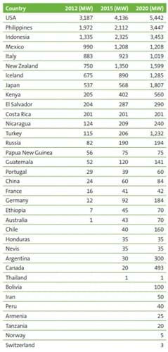 The table shows the installed and forecasted capacity of geothermal power plants around the world.