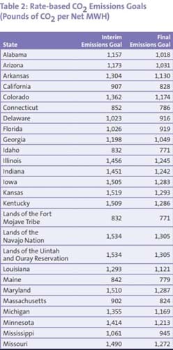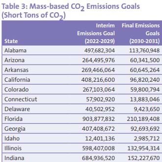 Interim targets are phased in during three multi-year compliance periods beginning in 2022. Final targets must be reached by 2030. A state could choose to focus on the rate of emissions per megawatt hour of electricity generated, in which case the targets in table 2 would apply, or the state could focus on the actual tons of CO2 emitted, in which case the “mass-based” targets in table 3 would apply.