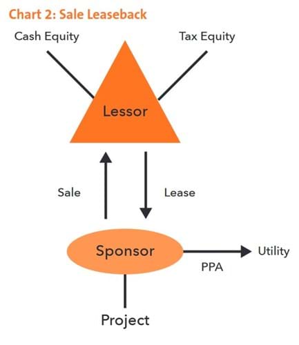 Another option is a sale-leaseback. In a typical sale-leaseback, the sponsor sells a project to a tax equity investor for its fair market value, and the investor leases it back to the sponsor. The tax equity investor keeps all of the tax benefits, and receives cash from the sponsor in the form of rent paid under the lease. The sponsor has taxable gain on the sale to the extent the value of the property exceeds what it cost to build.