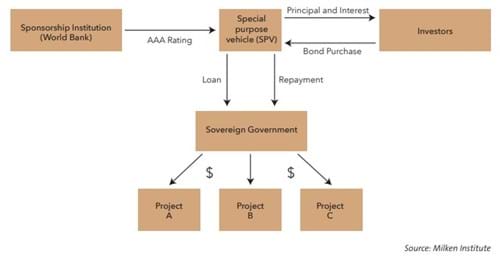 DFIs, such as the World Bank, also issue green bonds. An innovative feature of these green bond issuances is that a host government can leverage a sponsor institution’s credit rating to issue a debt that is to be repaid through a loan to the host government. For example, the World Bank could issue a green bond to help finance an infrastructure project in an emerging market, Country X. Country X would then repay the World Bank on the bond. Country X would benefit from the higher credit rating derived from the World Bank’s financial standing, which in turn would result in cheaper capital than if Country X were to issue the bonds on its own. This model has been applied in World Bank’s green bond issuances. The diagram on this page shows how to leverage a sponsor institution’s credit rating through a green bond issuance.