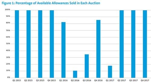 In 2016, a surplus of allowances in the market, combined with uncertainty over the future of the program, limited trading and kept prices low. In the quarterly state-run auctions for greenhouse gas allowances, just 52% of the allowances that were up for bid in 2016 and in the first auction of 2017 were sold, with fewer than 20% of available allowances sold in two of these auctions.