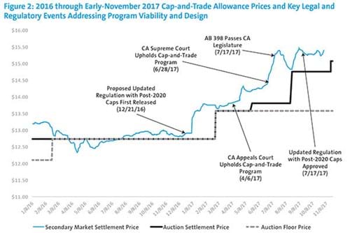 Prices for greenhouse gas emission allowances under the California cap-and-trade program have rebounded in 2017. Legal and regulatory uncertainties that had cast a shadow over the program’s future in 2016 have generally been resolved or are in the process of being addressed.