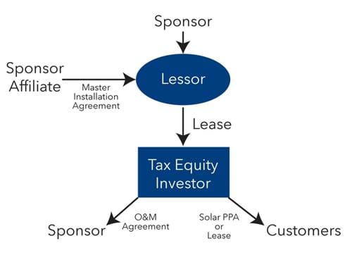 In some deals, a sponsor affiliate enters into a master installation agreement with the lessor to install solar systems as customer agreements are signed. More commonly, the sponsor contributes the equipment to the lessor which then leases it to the tax equity investor.
