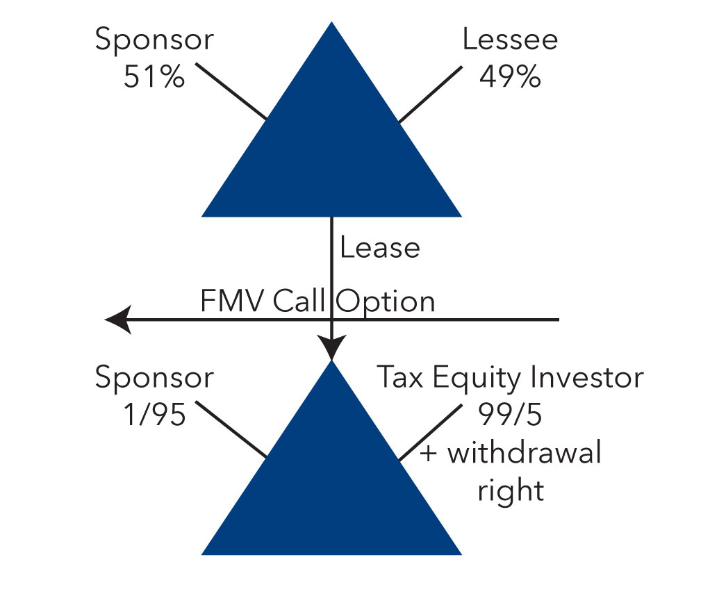 The overlapping ownership structure raises more tax equity because there are more tax benefits for the tax equity investor. Both the lessor and lessee are partnerships. The solar company owns not only 51% of the lessor, but it also owns a 1% interest in the lessee and acts as managing member. The solar company has an option to buy the tax equity investor interest after the recapture period has run on the investment tax credits. The tax equity investor has an option to withdraw from the partnership if the solar company does not exercise the option to buy out the investor.