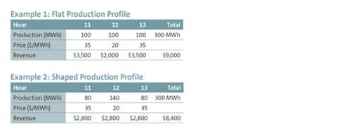 In both cases, the total energy and the average price are the same. However, the revenue is significantly lower in the second case, as the highest volume is produced in the lowest priced hour. In the first example, the production-weighted price is $9,000 divided by 300 MWh = $30/MWh, whereas in the second case the production-weighted price is $8,400 divided by 300 MWh = $28/MWh.